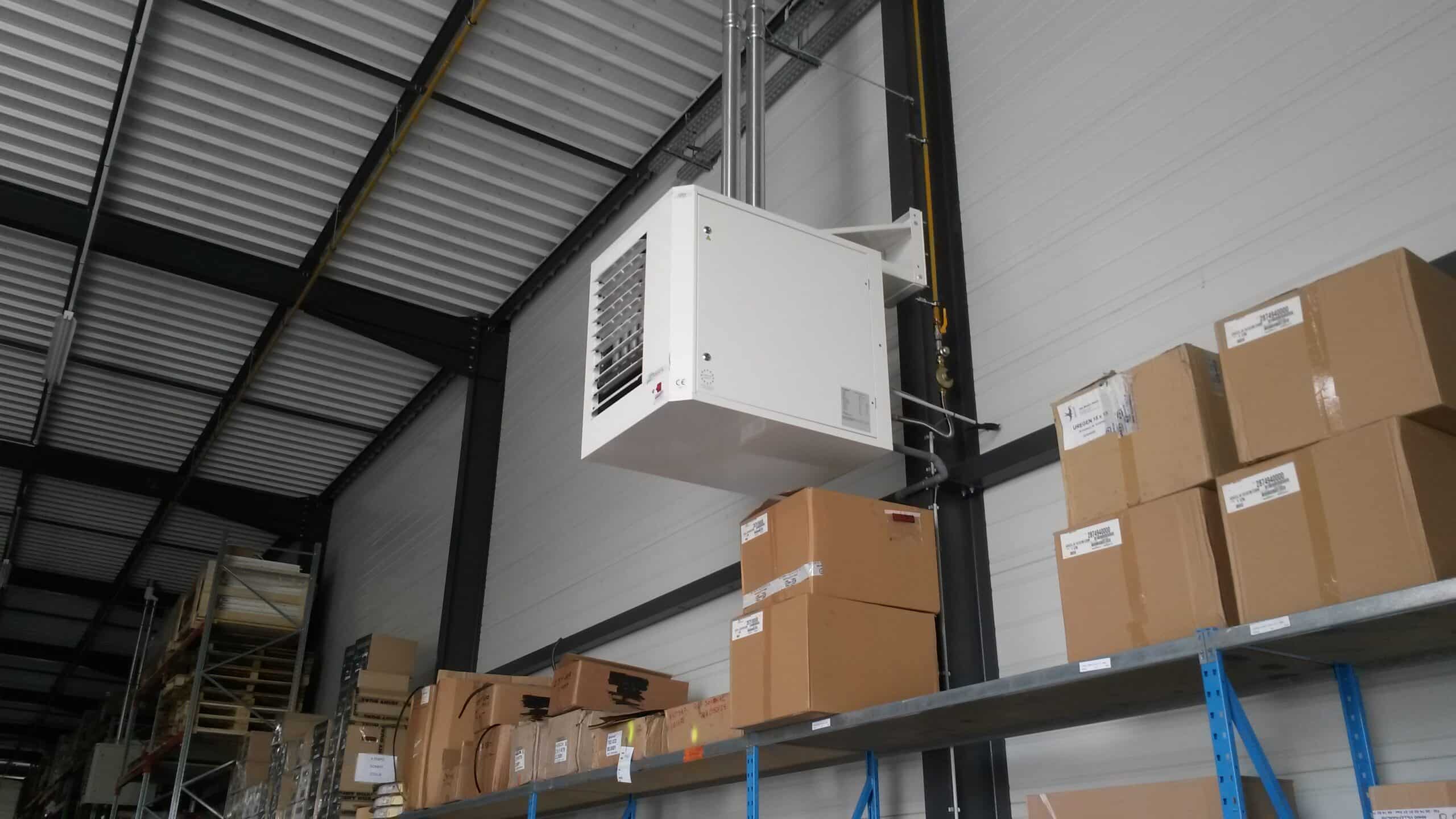Installés sous plafond, dans les travées de circulation comme des luminaires, les aérothermes verticaux (gaz ou eau chaude) diffusent la chaleur sans gêner l’espace de stockage. Ce système favorise également la destratification thermique, ramenant la chaleur accumulée en hauteur vers le bas.